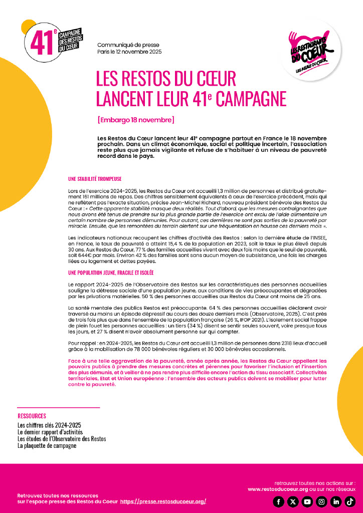 Les Restos du Cœur lancent leur 41e campagne ce mardi 18 novembre !